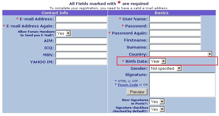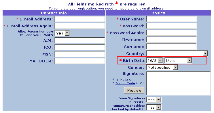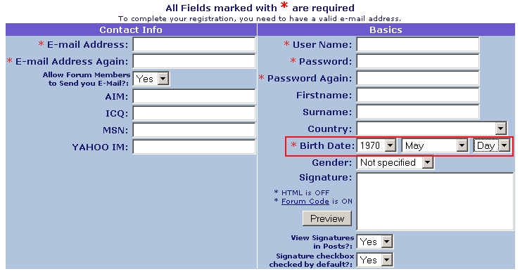 Sometimes there's some confusion about registering on the forum. Here is an explanation that might help some. When you fill out the registration form it asks you for your birth date but only has a drop down for the year. Once you click and select that drop down then another drop down will appear with the option to select a month. The only reason that this is done is to try and reduce automated spamming system from registering on the forum and spamming the forum. Here are some diagrams that show the appearance of the date drop downs after you select them: